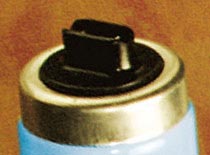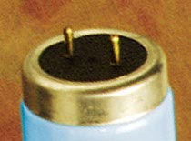 The most common type of lamp end connector. It is used in 71 and 59" lamps, and even on the standard 4 ft. lamps in most offices. It has two pins that slide into, then rotate into place to make electrical contact. This image shows the end of the bi pin lamp.