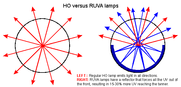 (Reflector lamp, UVA) Standard name for a HO lamp with a build in reflector. Usually more intense than a standard lamp because all the light is focused to the tanner. Must have lamps spaced close together to use them in a tanning bed. Usually found on more expensive equipment only.